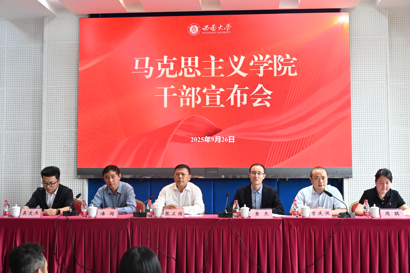 2025926日下午,学院在501报告厅召开干部宣布会。公司党委书记张卫国、党委副书记黄杰、党委常委、党委组织部部长曾庆洪出席会议,会议由公司党委常委、党委组织部部长曾庆洪主持,学院全体教职工参会。