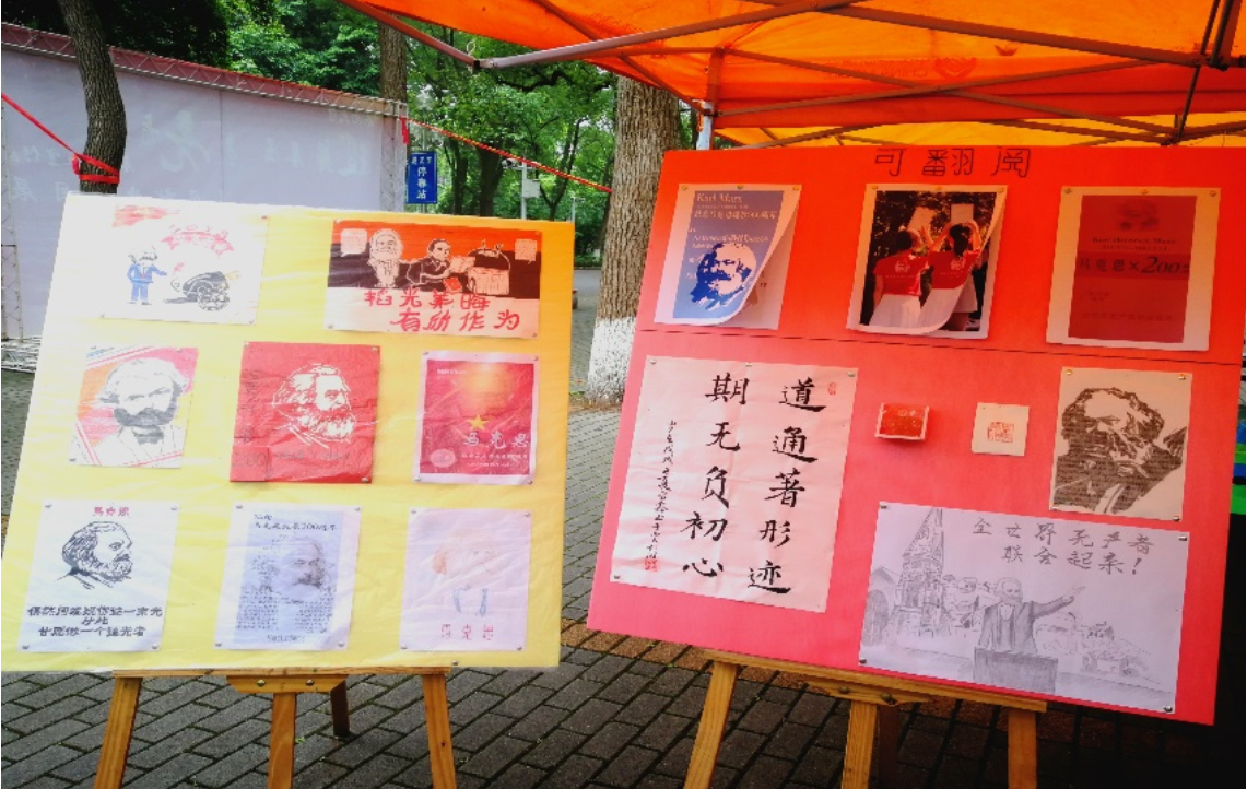 除了特色有趣的游戏体验与书籍漂流,在这里,还另设立了微创作成果展示区,悬挂马克思重要语录与生平事迹,展览同学们投稿的画报与照片,为众学子提供了一个咨询了解马克思的平台。志愿者们积极提供志愿服务,为大家介绍讲解,无论是关于马克思理论的疑惑还是学习马克思过程中遇到的困难,都有志愿者们耐心为同学们解答,他们的工作热情和态度得到了在场同学的一致好评!
