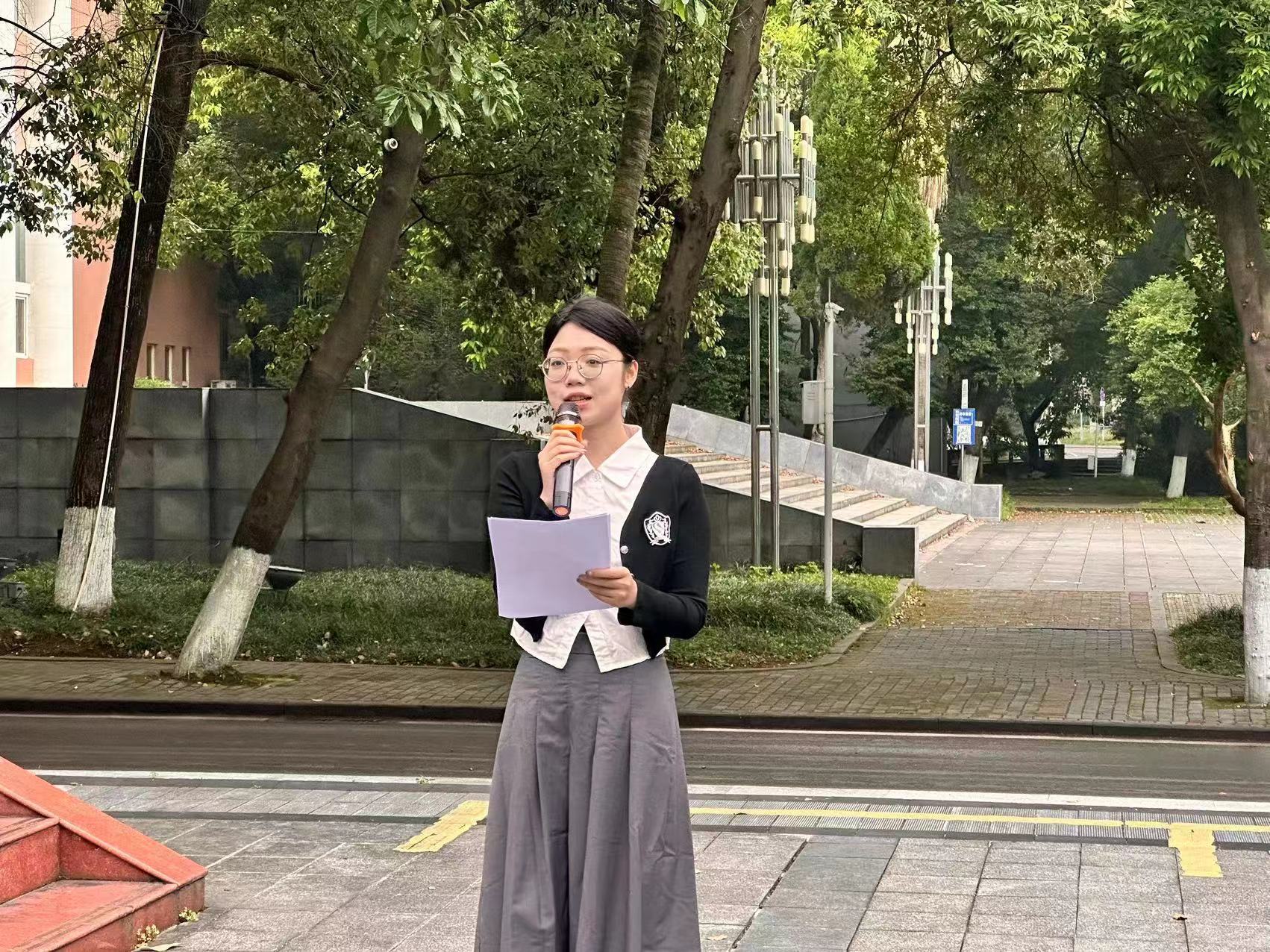 升旗礼毕,员工代表2021级本科生曾雨芊作国旗下的发言。她表示新时代青年要坚定理想信念,练就过硬本领,不畏艰难险阻,奋力书写中国式现代化的青春篇章。曾雨芊同学还共勉马院学子,要怀抱无比的自信,拼搏向前,竭尽全力施展抱负,建功立业。