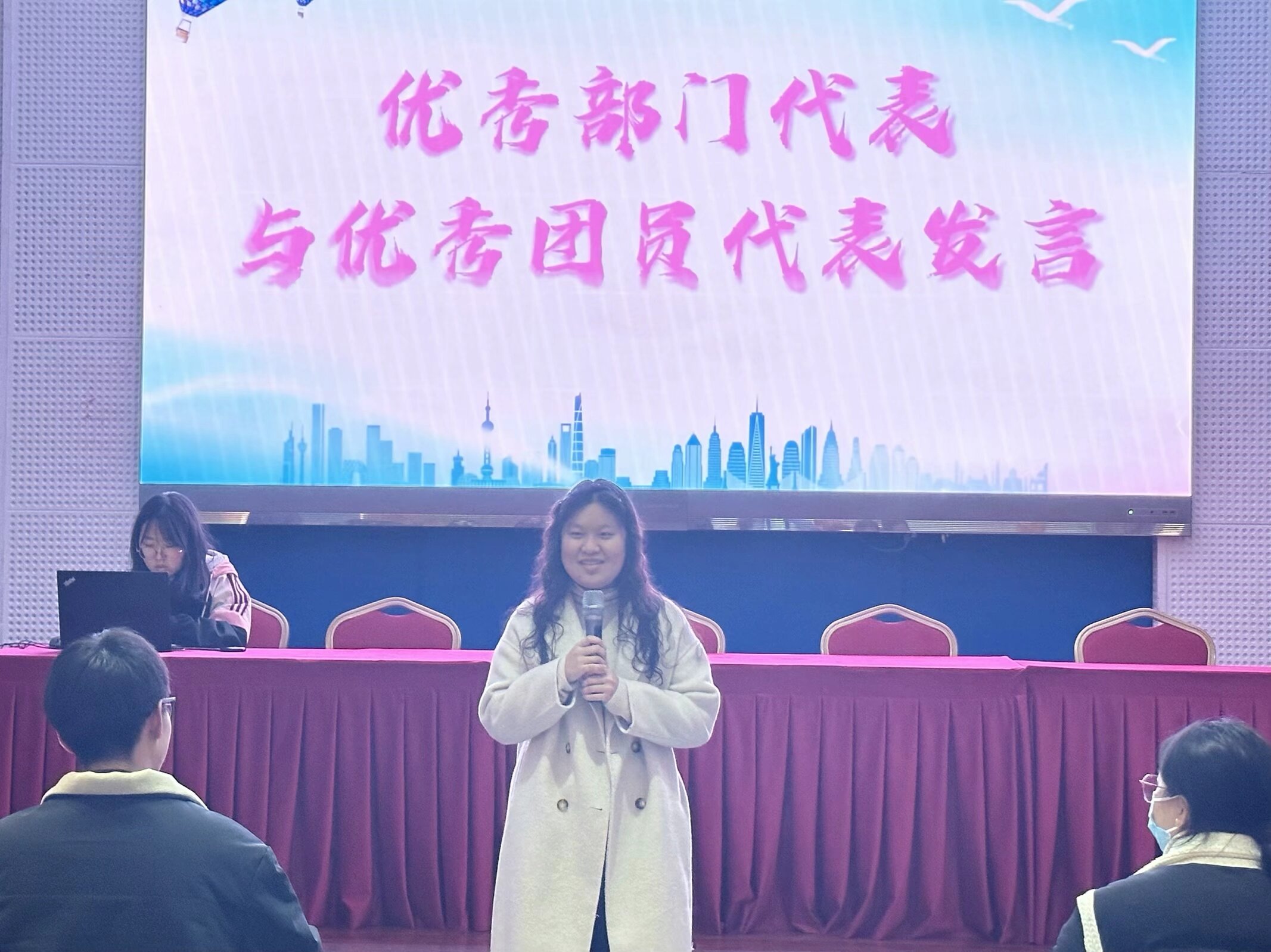 之后是优秀部门与优秀团员表彰环节,这一环节使得现场气氛达到了高潮。主持人公布优秀团员及优秀部门名单,恭喜办公室韩德贞、青马微声运营中心刘菊华、团学活动部黄雨沙、学研部伍琛妤、宣讲部王艺雯、培训部何沛津这六位团员荣获“优秀团员”称号,也祝贺青马微声运营中心和培训部这两个部门荣获“优秀部门”称号。这份荣誉是对他们在过去一学期辛勤付出的认可和肯定,团员们以热烈的掌声向他们表达了祝贺。随后优秀部门代表黄诗睿以及优秀团员代表何沛津发表了感言。