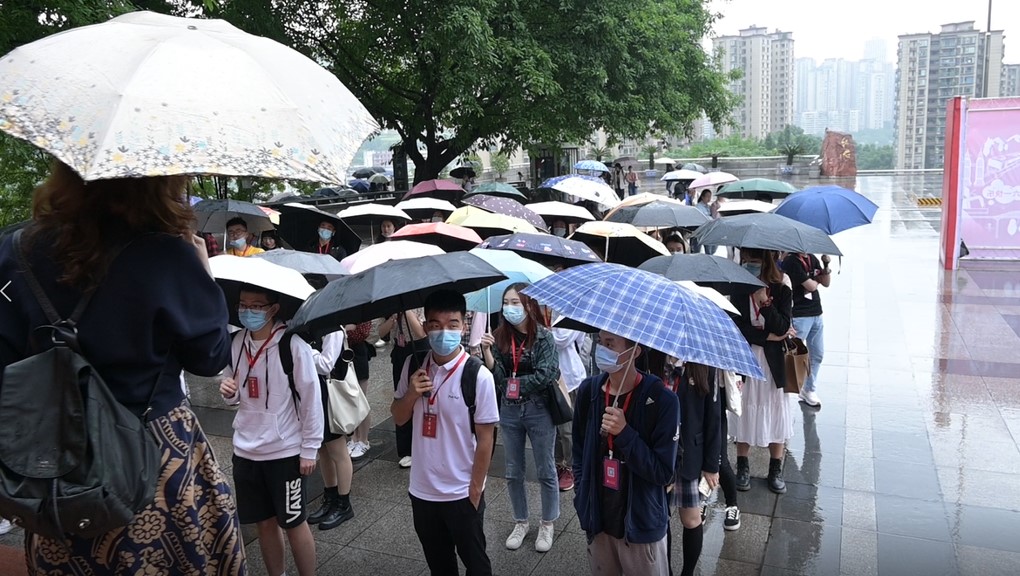 图2.同学们生冒雨参观红岩革命纪念馆