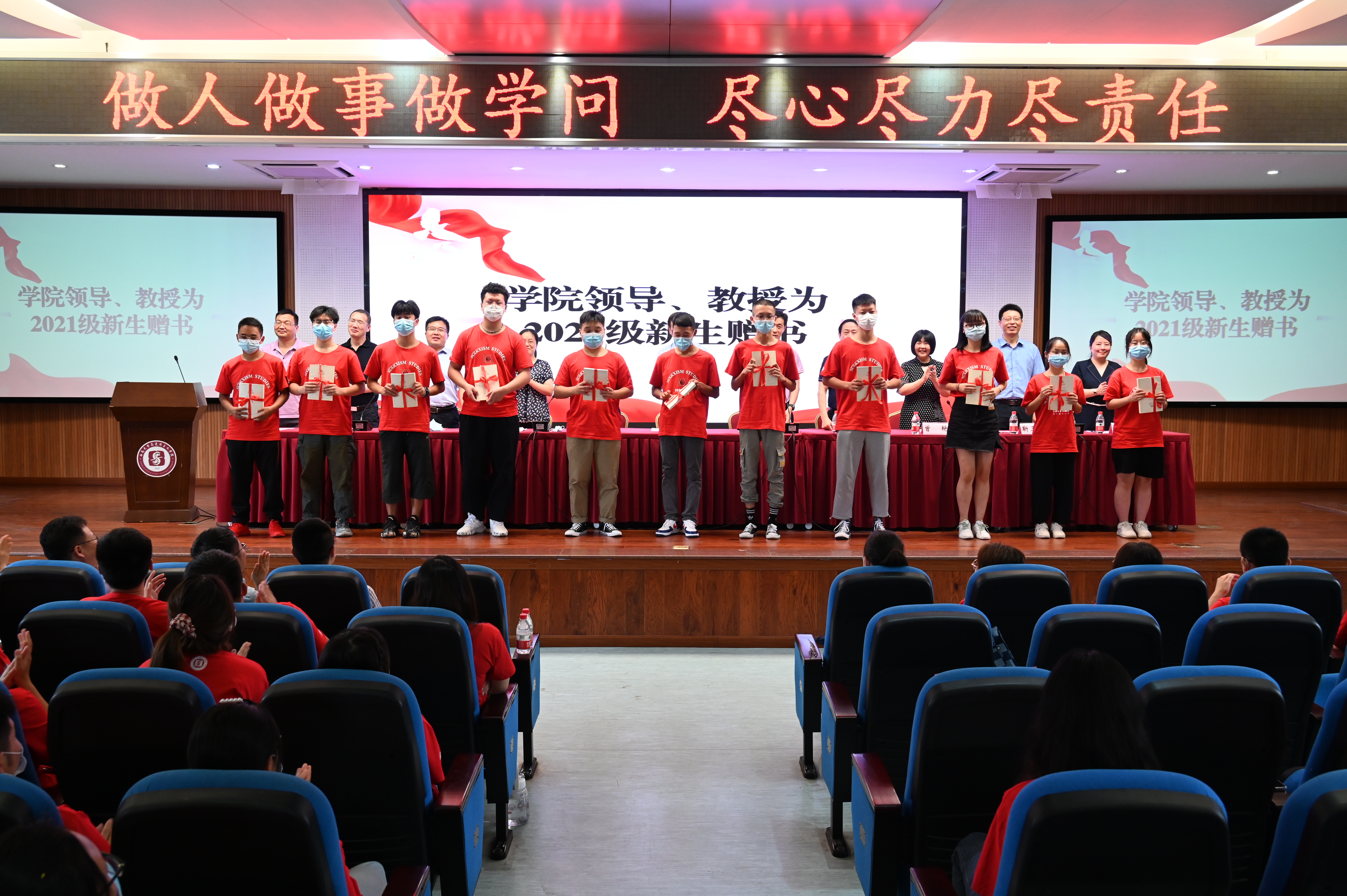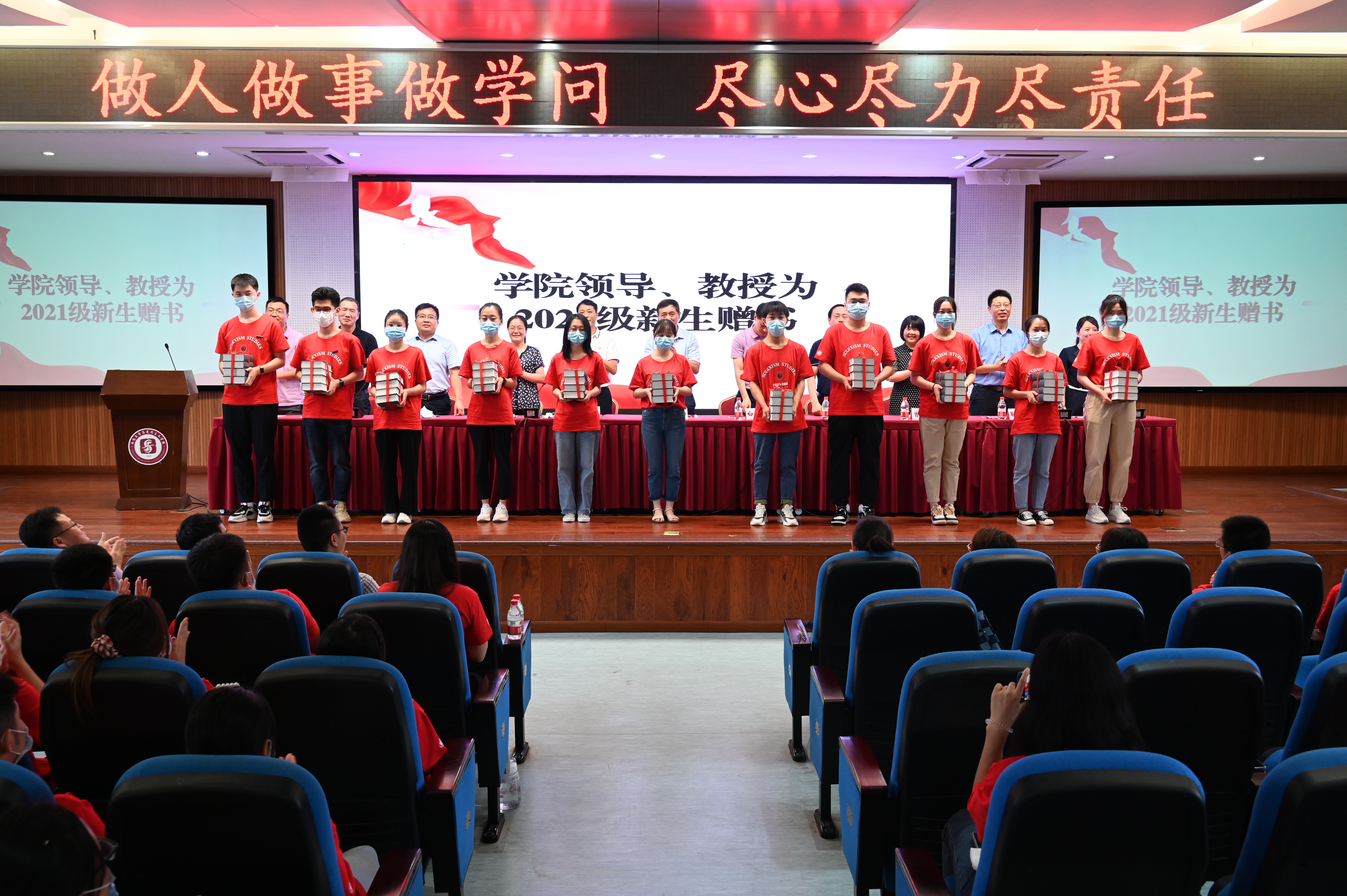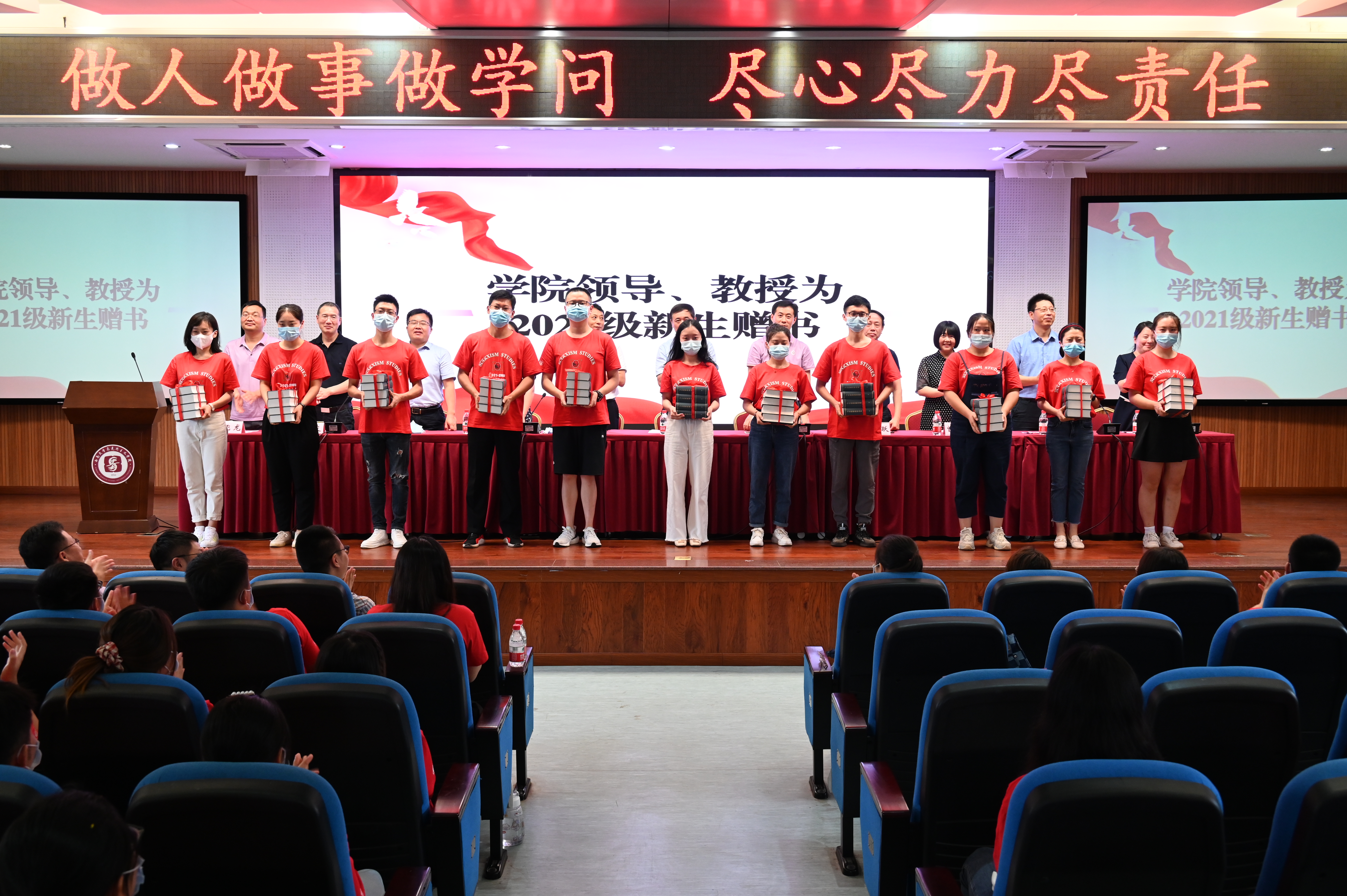 随后,学院领导、教授为2021级新生赠书。“读万卷书,行万里路”,一本本精致的书本承载着学院老师们对于新生的厚望,传递着浓浓的师生情谊。授书结束,白显良经理对新生进行寄语,表达了对新生的真切关怀与激励,希望他们在大学不负时代,不负韶华,为实现中华民族伟大复兴的中国梦而不懈奋斗。