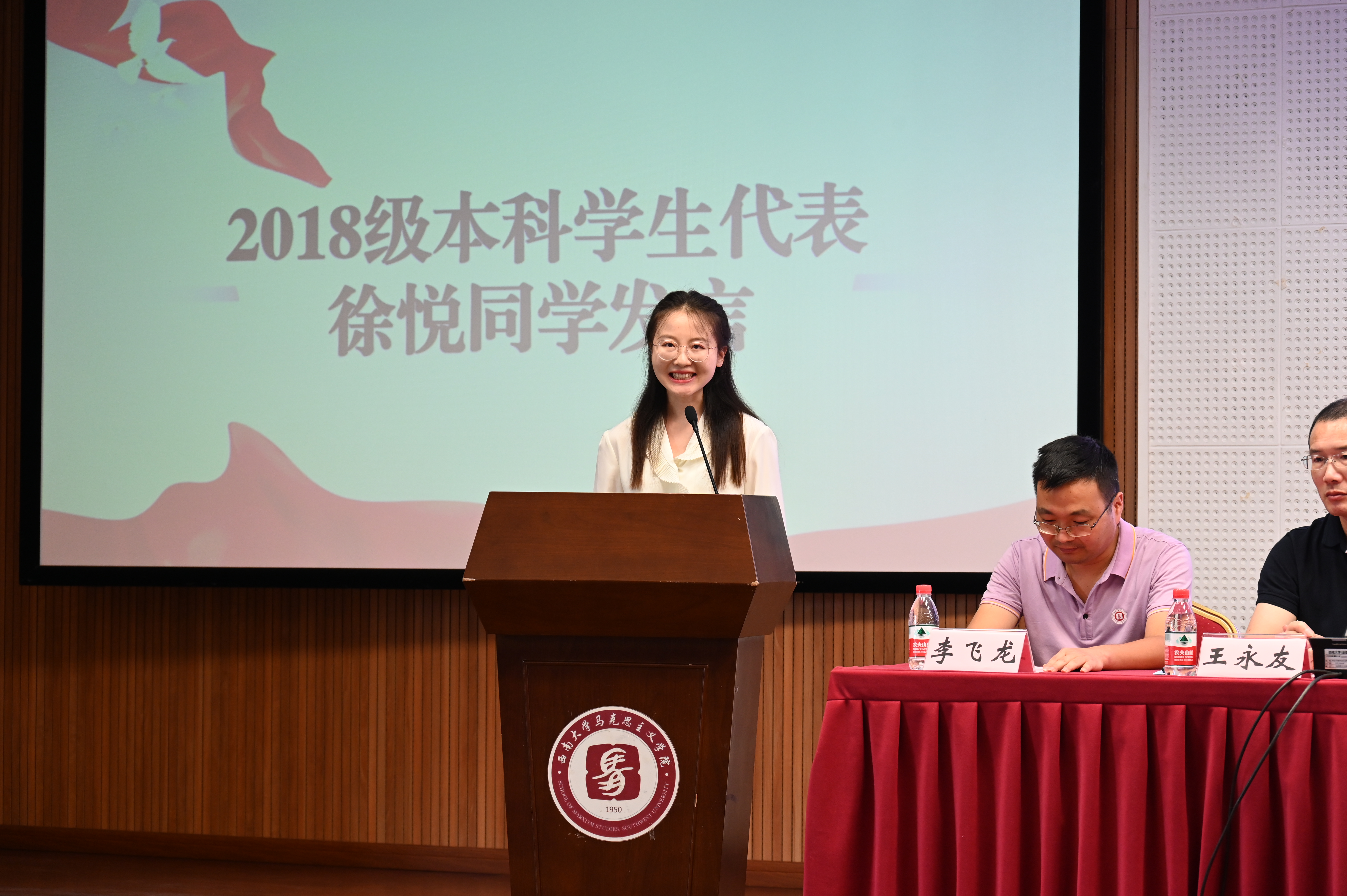 2018级本科员工代表徐悦同学表达了对学院的深切感恩,用自己的真切经历与同学们分享在四年学习中向下“扎根”,向上成长的感悟,激励大家不惧困难,从容自信,面对未来。研究生新生代表张钰同学从疫情中感悟“马院人”的责任与担当,表示自己将会积极学习“四史”,求真悟道,在实践中展现点点taptap官方网站的风采。