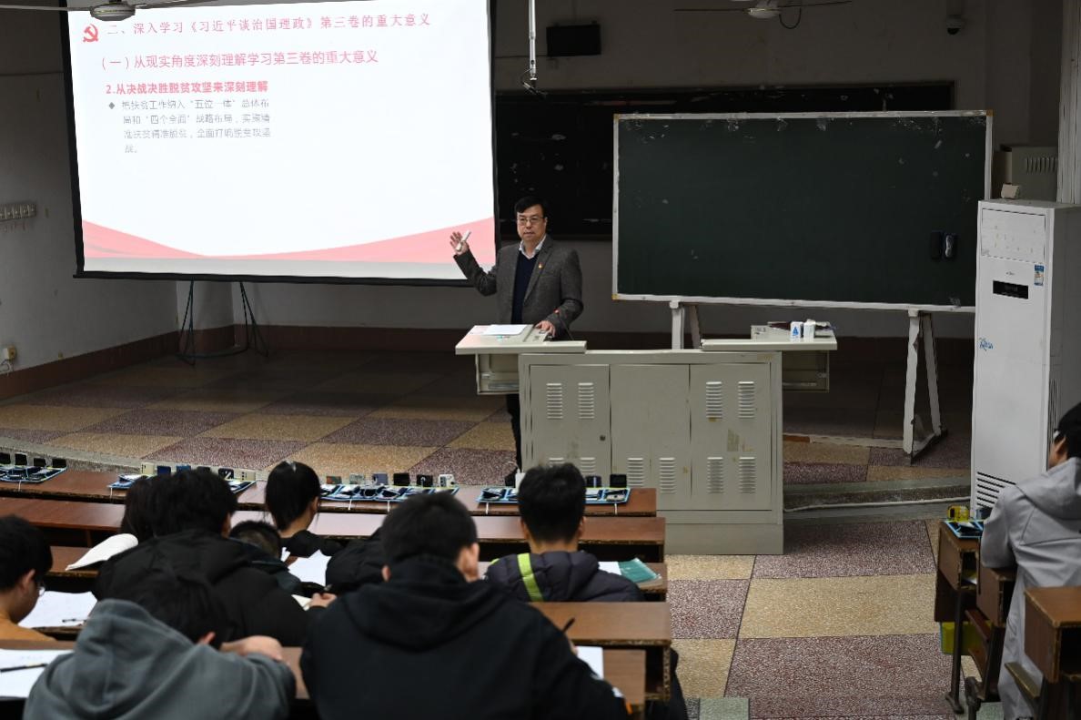 12月4日上午,点点taptap官方网站党委书记李旭锋以“在真学真懂真信真用中坚定理想信念 争做可堪大任的时代新人”为题,为荣昌校区动物医学院2019级本科生讲述了“深入学习《习近平谈治国理政》第三卷”的主要内容、重大意义和具体要求等内容,引导同学们深入学习《习近平谈治国理政》第三卷中具有原创性、时代性、指导性的重大思想观点,引导同学们深入掌握马克思主义思想方法和工作方法,引导同学们深刻领悟习近平总书记高尚的为民情怀和宽广的世界胸怀。李旭锋书记勉励同学们,要认真学习习近平新时代中国特色社会主义思想,用肩膀扛起责任,努力在为国家和民族建功立业中诠释“大爱”担当,争做新时代的追梦人、筑梦人和圆梦人。