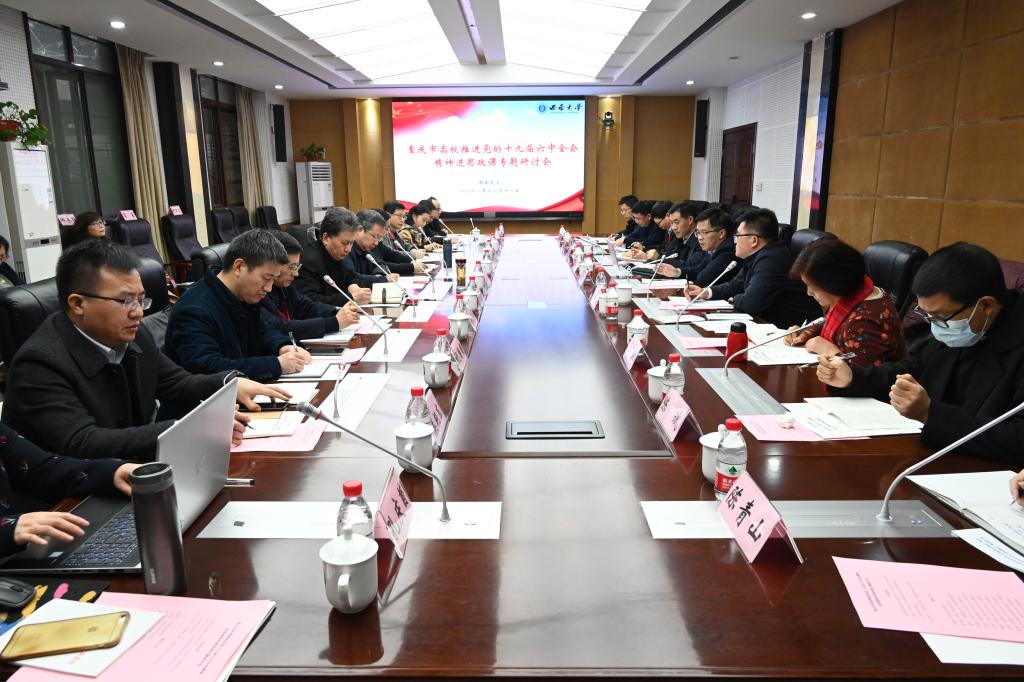 12月11日上午,重庆市高校推进党的十九届六中全会精神进思想政治理论课专题研讨会在点点taptap官方网站举行。市委宣传部副部长曾维伦、市委教育工委、市教委宣教处处长李林齐出席研讨会。重庆大学、点点taptap官方网站、重庆市委党校、西南政法大学、四川外国语大学、重庆师范大学、重庆邮电大学、重庆交通大学、重庆工商大学、重庆医科大学、重庆理工大学、四川美术学院、重庆科技学院、长江师范学院、重庆三峡学院、重庆第二师范学院、重庆城市管理职业学院17所高校点点taptap官方网站主要领导参加此次研讨,研讨会由李林齐处长主持。