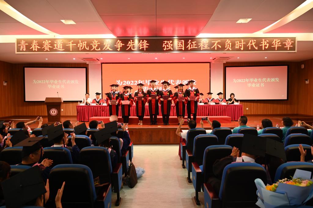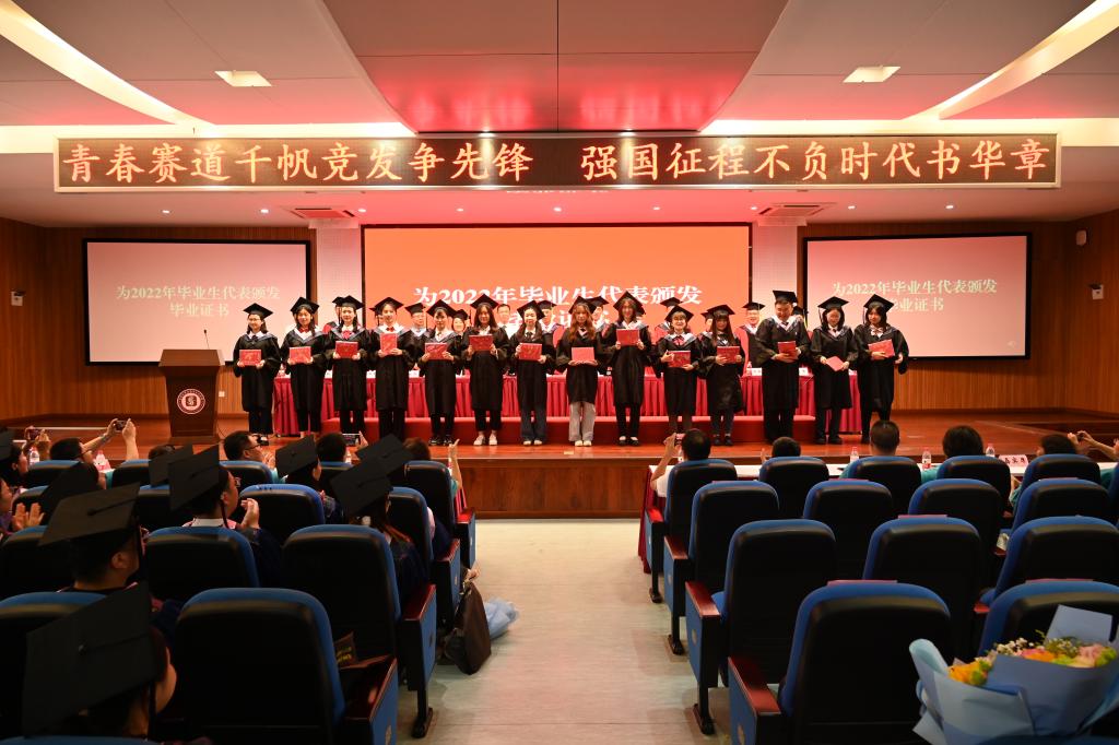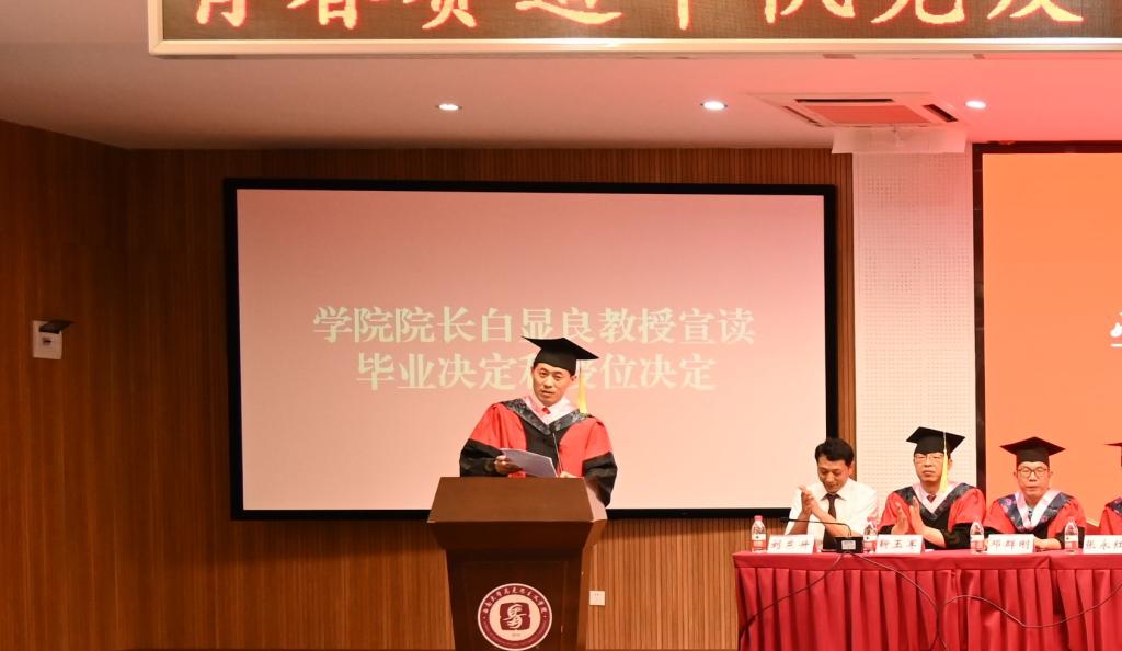 毕业典礼在国歌声中拉开序幕。经理白显良教授宣读毕业决定和学位授予决定,学院领导老师向2022届毕业生代表颁发毕业证。