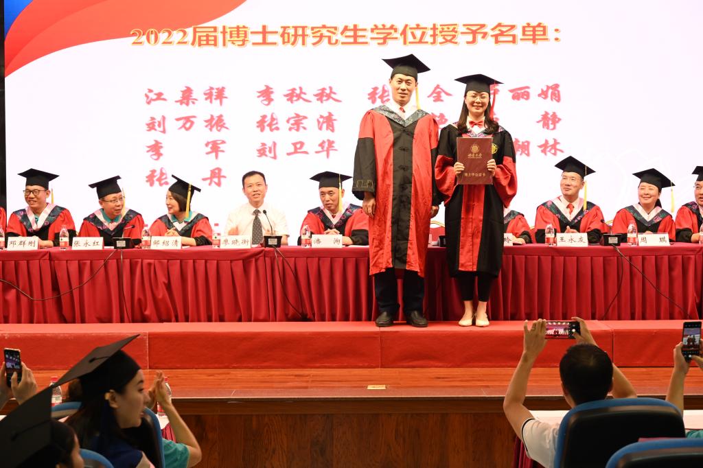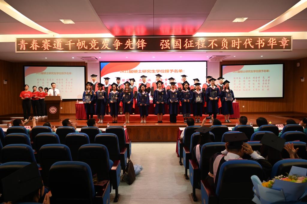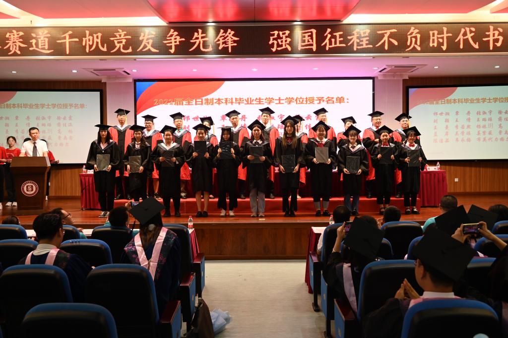 在激昂的音乐中,学院学术委员会老师为2022届毕业生授位。