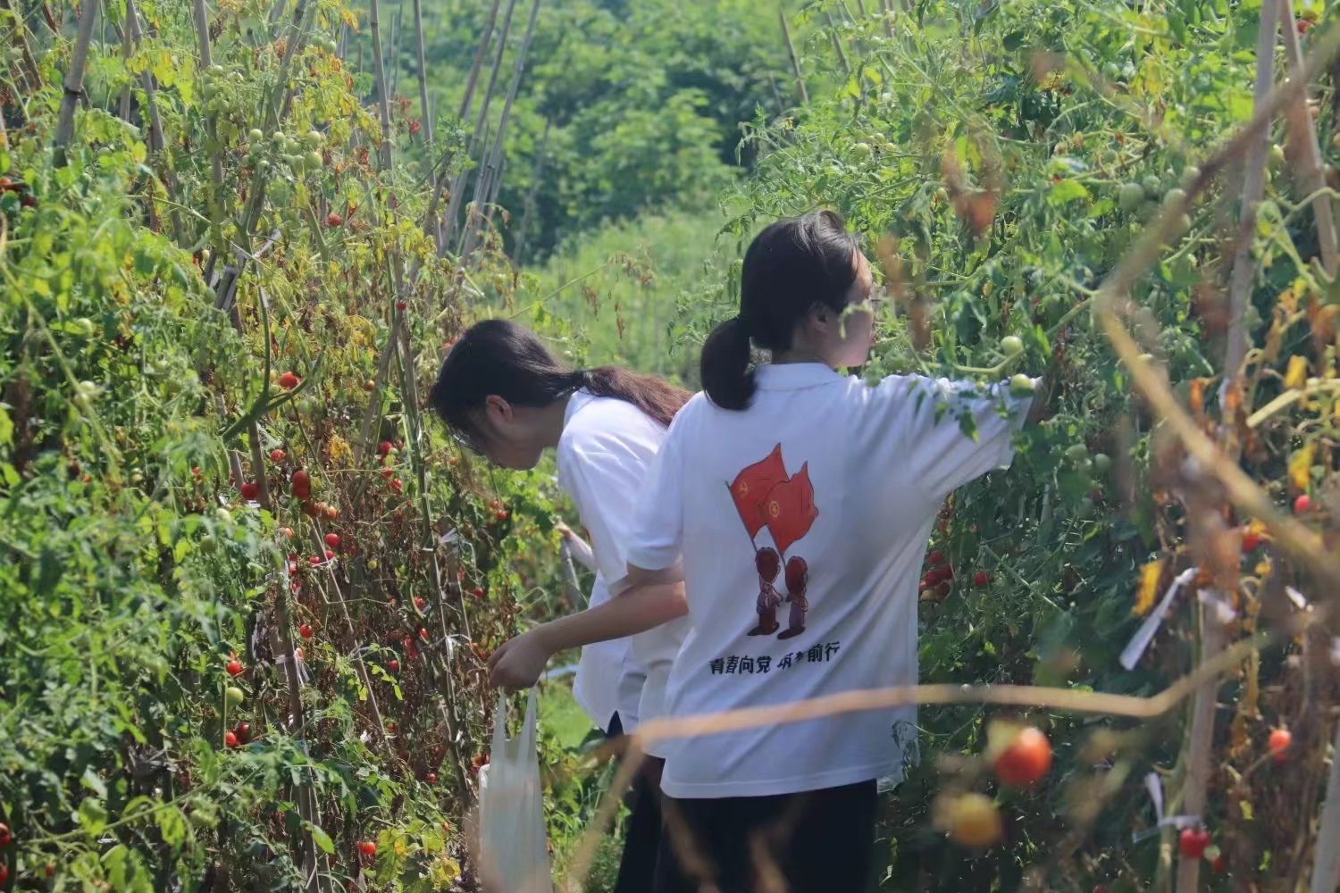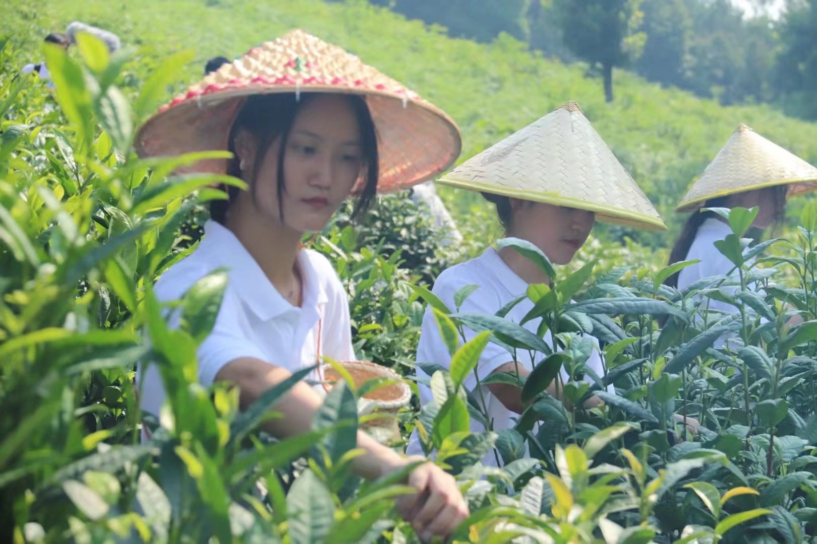 7月6日上午,实践团来到史家村茶山,顶着炎炎烈日,帮助当地茶农采摘茶叶,并亲身参与了炒茶制茶的过程。
