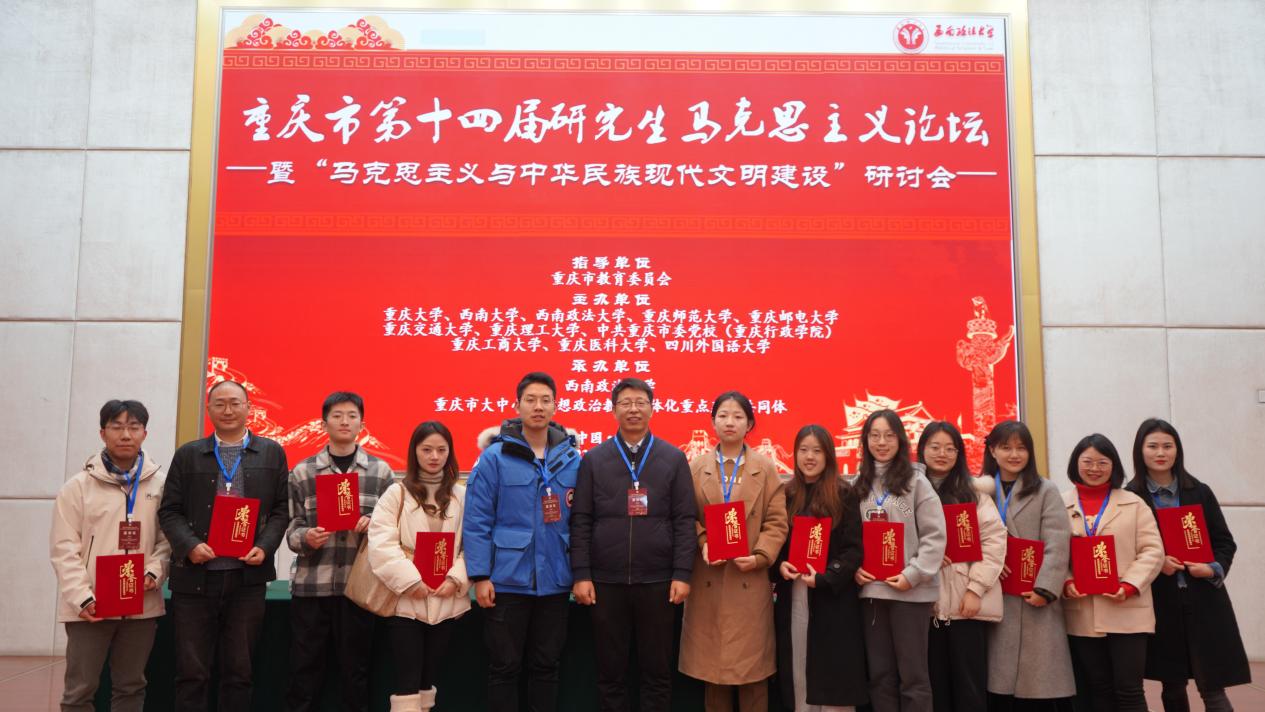 2023年12月10日,重庆市第十四届研究生马克思主义论坛暨“马克思主义与中华民族现代文明建设”研讨会在西南政法大学毓才楼一楼学术报告厅举行。本次研讨会由重庆市教育委员会指导,重庆大学、点点taptap官方网站、西南政法大学、重庆师范大学、重庆邮电大学、重庆交通大学、重庆理工大学、中共重庆市委党校(重庆行政学院)、重庆工商大学、重庆医科大学、四川外国语大学共同主办,西南政法大学、重庆市大中小学思想政治教育一体化重点建设共同体联合承办。学院副经理靳玉军、研究生辅导员黄林及研究生获奖代表穆佳滢等13名同学参加本次研讨会。