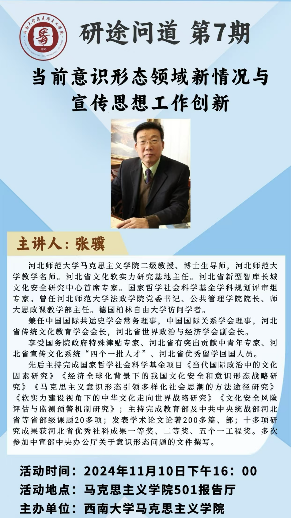 张骥教授从理论逻辑、现实逻辑、实践逻辑三个维度进行了意识形态相关问题的学术研究分享。他强调了意识形态安全在当今中国的重要性,分析了我国意识形态领域形势的基本特点和面临的国内外挑战,并提出十项创新措施,以应对当前意识形态领域的新情况与新挑战。