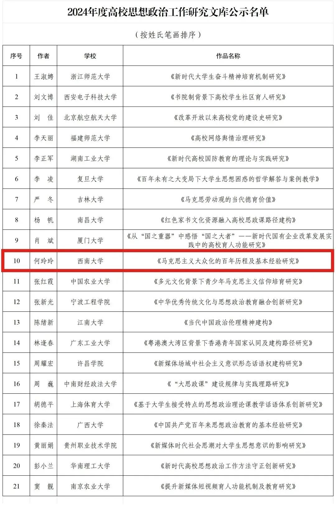 2项成果分获第九届高等学校科学研究优秀成果奖(人文社会科学)二等奖、三等奖;4项成果获重庆市第十二次社会科学优秀成果奖,其中一等奖2项,二等奖2项(公示中)。在教育部2024年度高校思想政治工作质量提升综合改革与精品建设项目遴选中获得佳绩,何玲玲教授入选高校思想政治工作研究文库。成果产出硕果累累。获批省部级以上科研项目39项,其中国家社会科学基金重大研究专项“抗美援朝战争口述资料采录与整理”获滚动资助40万,教育部哲学社会科学研究重大课题攻关项目1项,国家社科基金项目9项(国家级重大人才专项1项、重点项目1项),国家文物局革命文物研究项目1项,教育部人文社科研究项目3项,重庆社科规划项目、重庆市教委人文社会科学研究项目等24项(其中重大重点项目9项)。在CSSCI来源期刊上发表学术论文80余篇,其中在《马克思主义研究》上发表论文6篇,分别是黄蓉生教授《40年来思想政治教育专业与学科变革实践的多域审思》、邹绍清教授《建设中华民族现代文明的核心要义、价值意蕴及实践遵循》、唐棣宣教授《习近平总书记关于解决大党独有难题的重要论述探析》、罗亮副教授《中华民族现代文明的要素结构、显著特征与系统建设》、邓湖川副教授《恩格斯<自然辩证法>的自然观及其对我国生态文明建设的启示》、王绍霞副教授《中国式现代化视阈下的思想政治教育高质量发展——“2023年全国思想政治教育学术研讨会”综述》。出版学术著作13部,17篇资政报告被中央和省级政府部门采纳。