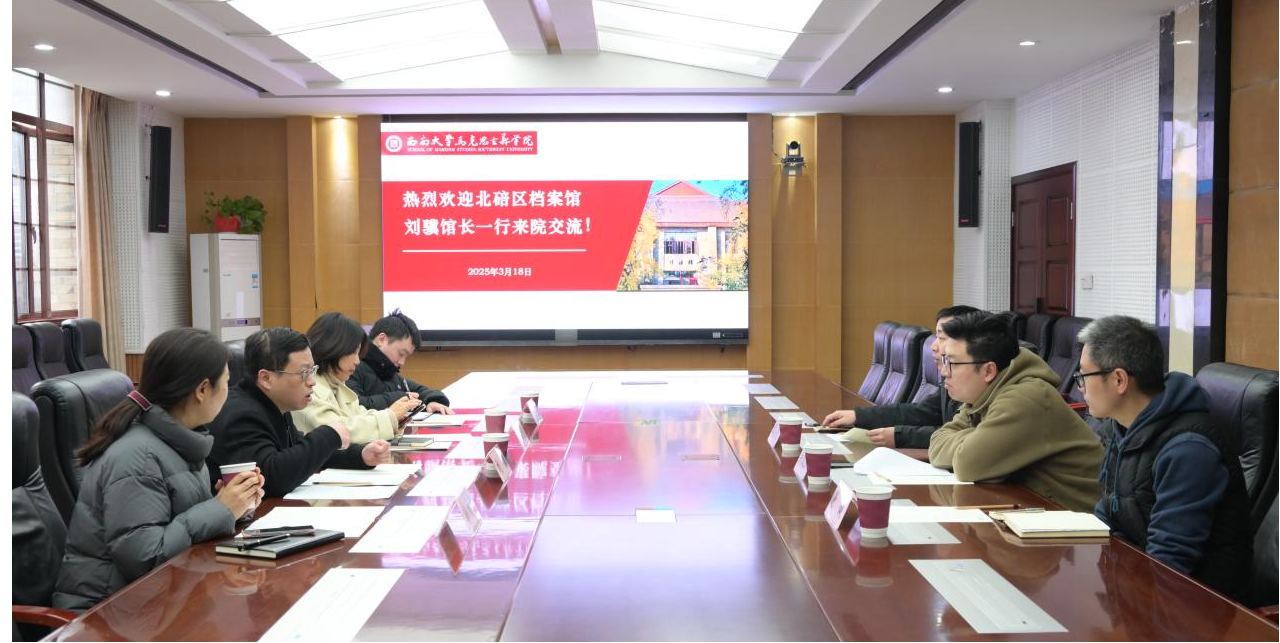 3月18日下午,重庆市北碚区档案馆刘骥馆长一行到学院开展交流。北碚区档案馆副馆长刘雪莲、办公室主任彭文娟、工作人员尹宇,公司党委书记吴文杰、中国近现代史教育系系系主任谢健、党支部书记张亮参加会议。