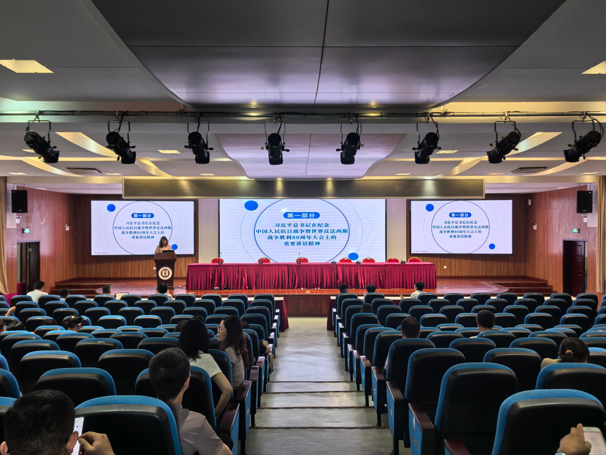 2025年9月12日下午,学院在505报告厅开展2025年第八次教职工政治理论学习,集中学习了习近平总书记在纪念中国人民抗日战争暨世界反法西斯战争胜利80周年大会上的重要讲话精神、《求是》杂志发表的习近平总书记重要文章《弘扬伟大抗战精神,向着中华民族伟大复兴的光辉彼岸奋勇前进》、习近平总书记对深入贯彻中央八项规定精神学习教育作出的重要指示精神和2025年秋季学期开学干部大会精神,观看了“西大教师故事”侯光炯老师的短视频。学院全体教职工参加,公司党委书记吴文杰主持,本次教职工政治理论学习由学院马克思主义基本原理教育系教师党支部书记邓春芝领学。