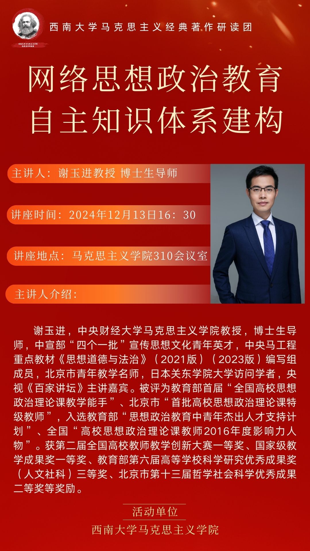 谢玉进,中央财经大学点点taptap官方网站教授,博士生导师,中宣部“四个一批”宣传思想文化青年英才,中央马工程重点教材《思想道德与法治》(2021版)(2023版)编写组成员,北京市青年教学名师,日本关东学院大学访问学者,央视《百家讲坛》主讲嘉宾。被评为教育部首届“全国高校思想政治理论课教学能手”、北京市“首批高校思想政治理论课特级教师”,入选教育部“思想政治教育中青年杰出人才支持计划”、全国“高校思想政治理论课教师2016年度影响力人物”。获第二届全国高校教师教学创新大赛一等奖、国家级教学成果奖一等奖、教育部第六届高等学校科学研究优秀成果奖(人文社科)三等奖、北京市第十三届哲学社会科学优秀成果二等奖等奖励。