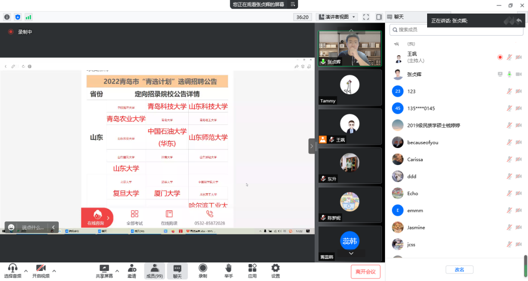 张贞辉同学就青岛市人才引进的经验进行了分享。首先,他认为,人才引进比选调难度略低,建议大家可以对各个地区的人才引进计划多加关注,认真查阅招聘公告中的条件、待遇等。其次,他介绍到人才引进只有面试没有笔试,主要考察大家的岗位匹配程度,因此简历在初选中占比30%-50%,建议大家好好准备出彩的个人简历。最后,他认真解答了同学提出的问题,建议大家从当地政务信息网和相关的公众号中广泛查找招聘信息。