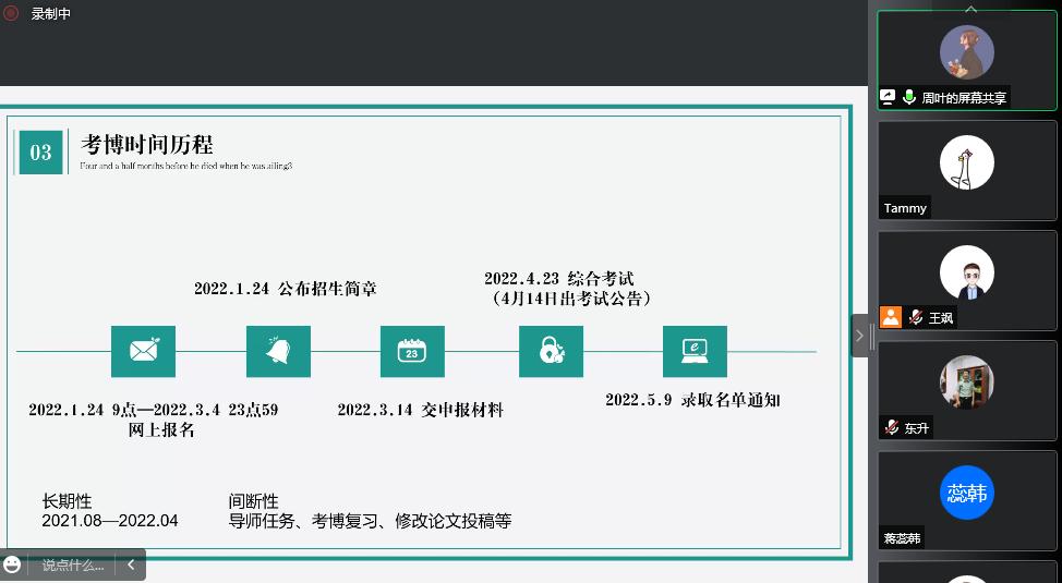 周叶同学根据点点taptap官方网站的具体情况,从“为什么读博”、“考博需要准备”、“考博时间历程”、“考博零碎经验”四个方面进行了针对性的分享。她提出读博也许有很多原因,也将面临多重挑战,但关键在于导师和个人,建议大家认真思考自己是否适合读博以及是否具有读博的意愿。其次,她为大家考博的准备提出了三点内容:一是提早完成毕业论文;二是积累相关学术成果;三是准备复习材料,明晰重难点。随后,她提出考博是兼具长期性和渐进性的过程,时间持续较长,但期间可能受到各种因素的影响,需要合理进行安排。最后,周叶同学细致分享了自己考博的经验,涵盖了保持身体健康、调试心理压力、注重同学间信息交流等多方面的内容。