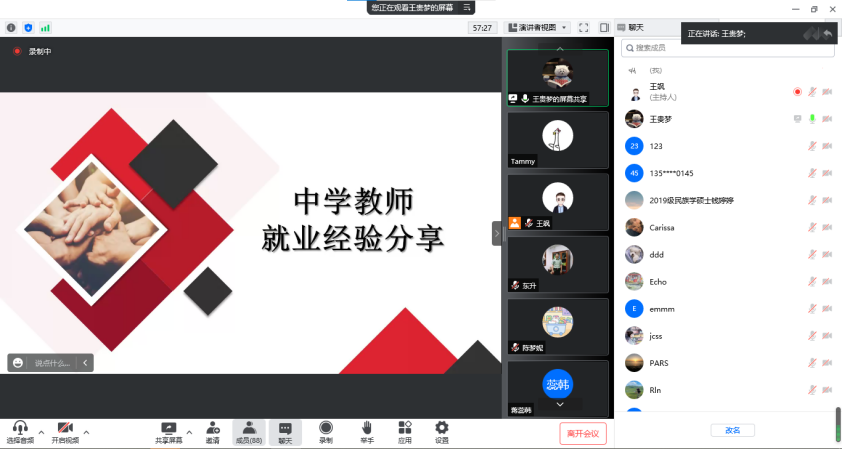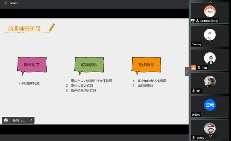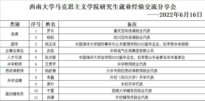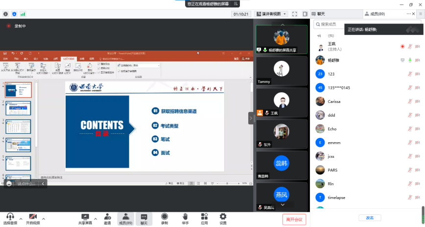 随后,11位同学从定向选调、国考、企事业单位、人才引进、中学教师、思政课教师、升学读博、高校辅导员等多角度、多方向,为大家带来了精彩的就业经验分享。