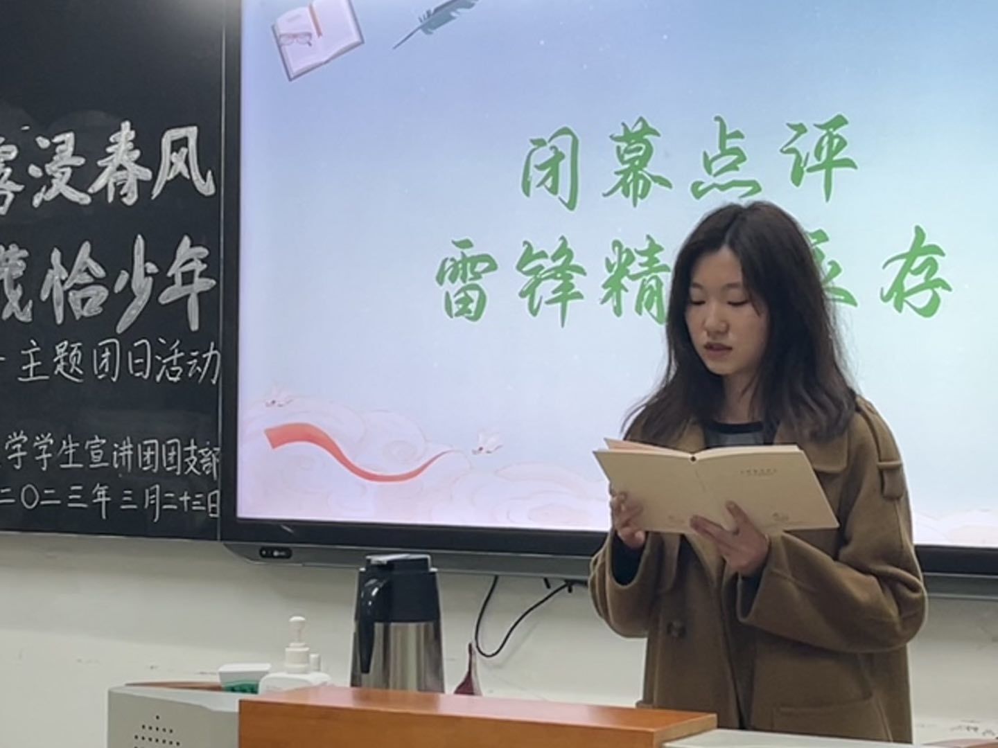 团日活动的最后,主席团成员李思慕进行了总结点评,认可了整场活动的环节设计,指出了一些有待改进的不足,并激励团员们擎起雷锋精神的大旗,在今后的生活中坚定不移地践行雷锋精神。