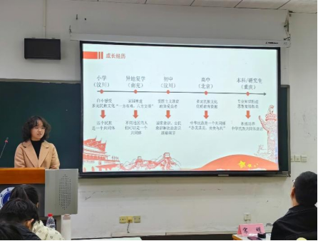教育学部的贾永仪同学从自身的成长经历出发,与大家分享了她对于中华民族共同体意识的看法。她从自己的专业学习出发,向大家分享了铸牢中华民族共同体意识的逻辑层次,并提出铸牢中华民族共同体意识要根据员工的认知发展规律,把握不同年龄阶段的特征,确定学校教育在不同阶段中铸牢中华民族共同体意识的着力点。