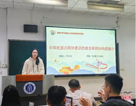 心理学部的杨慧玲同学从心理学的视角与大家分享了自己对于铸牢中华民族共同体意识的看法,她认为要通过开展多元文化教育、激发自我意识、发挥学校积极作用等形式铸牢青少年中华民族共同体意识,同时,各民族青少年要行动起来,将铸牢中华民族共同体意识落到实处,更好地让中华民族共同体意识在青少年群体当中生根发芽。