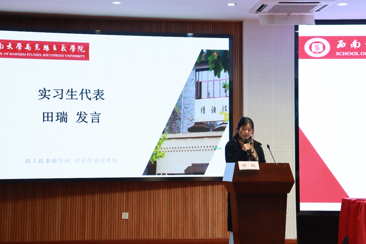 随后,实习员工代表田瑞发言。她首先对学校、学院和老师们对本次实习的精心组织表达了衷心感谢,并代表全体实习生表态:将秉持学院做人做事做学问、尽心尽力尽责任的精神,在实践中磨练、提升和完善自己,争取以优异的成绩争取圆满完成实习任务。