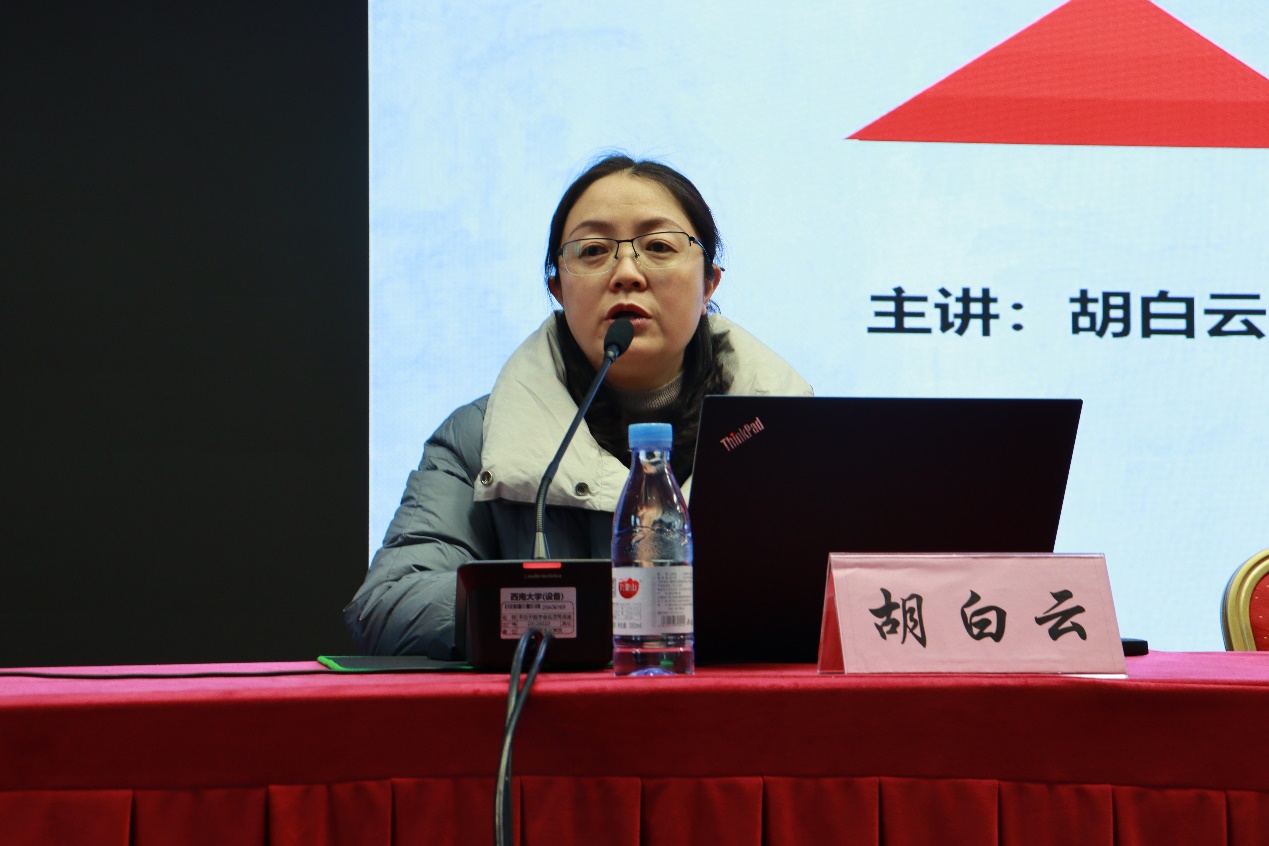 实习动员会后,教师教育学院副教授胡白云对全体同学进行了教学技能专题培训。她以教学能力评价标准为切入点,从教学语言训练和关键课堂技术训练两个板块对同学们进行技能指导。她指出,教学语言包括三种形式,在口头语言中应注重语流、语气和词句;在体态中应留意姿态、表情和仪表;在板书中应关注字体、版面和速度。她运用图文资料、影像资料等形式全方面为同学们讲解了导入、启发、提问、总结和应变的技术。精确的案例、丰富的课件、引人入胜的讲解,让在场同学都受益匪浅,为同学们今后的实习实训打下了坚实的技能基础。