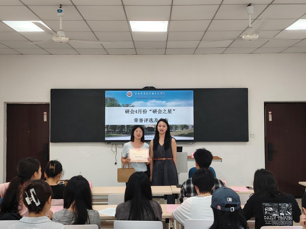 最后,会议进行4月份“研会之星”颁奖仪式,由骆雪洁为本月“研会之星”获得者罗春梅同学颁发奖状。综合办工作人员罗春梅发表了自己的获奖感悟,她对师兄师姐和各位同学的帮助表达了感谢,并表示今后会更加积极工作,尽心为同学们服务。