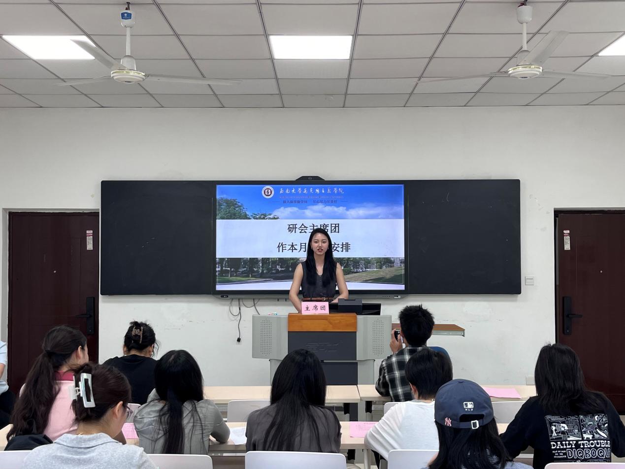 研会主席团成员作本月工作安排。执行主席骆雪洁总结研会上月整体工作情况,并对本月工作进行了安排部署,指明了今后的工作方向。她指出,第一,活动需要提前做好各项准备工作,特别是在多个部门合作的情况下,一定要及时地沟通交流,避免工作对接失误;第二,她预告研会换届工作即将进行,并表示想继续留任的成员可以提前做好准备,同时提醒大家仍然要积极顺利完成本届研会的收尾工作;第三,研途助励说第二期活动即将开展,她建议研会成员积极参加,广泛宣传。