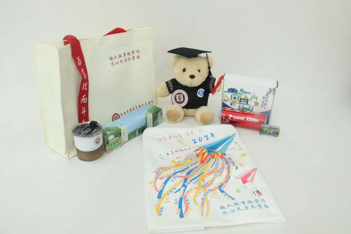 公司为毕业生们精心准备了丰厚的毕业大礼包。每位毕业生都有一件公司特制的纪念版T恤,以及一个可爱温馨的毕业小熊,它们不仅是公司文化的象征,更传递着学院对每位即将离校的学子的不舍与期盼。此外,本科2024届同学们自己还设计了多种富有创意的纪念品:一瓶印有“毕业快乐”和学号姓名的定制版可乐,一套实用美观的冰箱贴,一只颇具学院特色的帆布包和一个精致小巧的水杯。这些纪念品既承载了毕业生们的校园回忆,也代表着学院对他们的诚挚祝福。