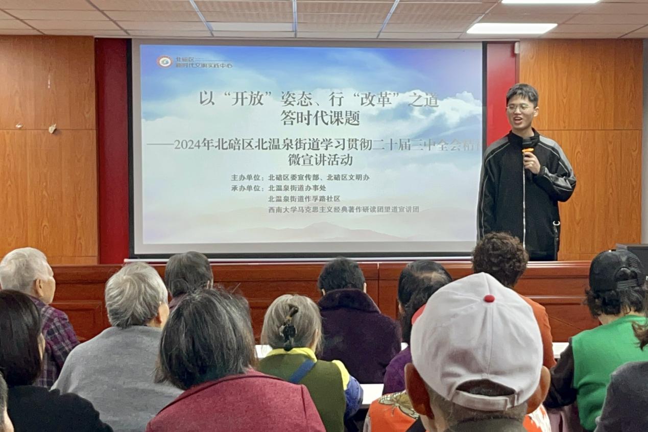 为深入学习贯彻党的二十届三中全会精神,准确把握习近平总书记重要讲话精神实质,着力推动党的二十届三中全会精神落地生根,2024年11月1日下午,点点taptap官方网站马克思主义经典著作研读团走进北碚区北温泉街道作孚路社区开展了主题为“以‘开放’姿态、行‘改革’之道、答时代课题——深入学习贯彻党的二十届三中全会精神”的宣讲活动。