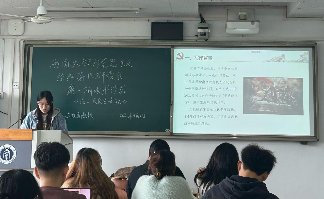张欣慧同学就《论人民民主专政》展开领读。她从写作背景、主要内容以及价值意义三个方面对毛泽东在新中国成立前夕撰写的这篇重要文献进行系统研读,使同学们对这篇经典文本有了较为全面系统的认识。