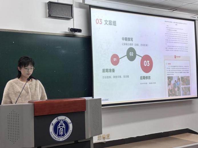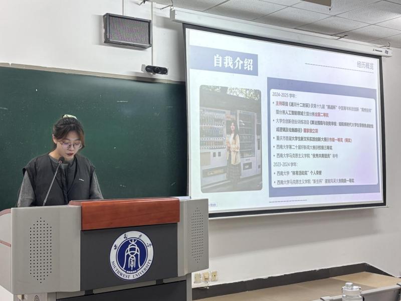 在经验分享环节,荣获重庆市首届老员工新文科实践创新大赛一等奖的王亚洁同学系统解析了赛事体系,涵盖比赛文件的精准解读、关键信息提炼、团队组建及导师选择等环节,为与会同学提供了清晰的备赛路径与实用的实践策略。荣获“挑战杯”学术科技竞赛重庆市一等奖的舒昱洵同学结合自身获奖项目,深入分享了科研选题、团队协作、实地调研及答辩准备等方面的经验,内容详实、方法具体,为同学们提供了可复制的竞赛参考和有效指导。