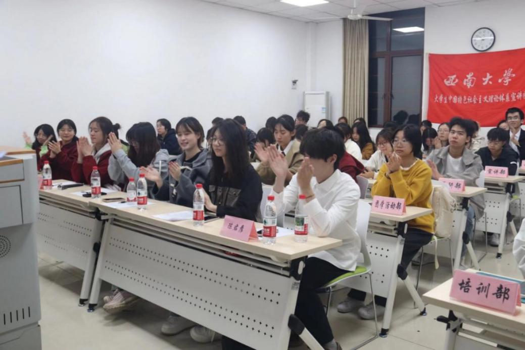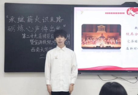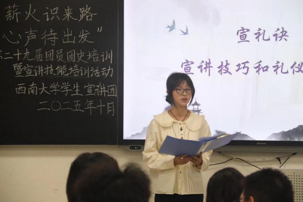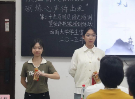随后,陈君彦带来主题示范宣讲,胡冶柯和袁静先后进行宣讲技巧及礼仪培训、撰稿技巧培训;在大家热情高涨之际,活动将快板表演与技能教学相结合,“打板传花”将气氛推向高潮。活动尾声,往届师兄师姐为新团员寄语,鼓励他们以奋斗为基,砥砺前行。