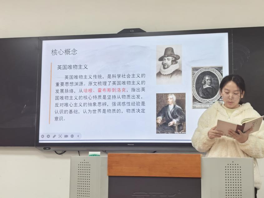 在“领读”环节中,王英宇、熊玲同学分别从不同视角切入进行解读和分享。王英宇同学聚焦“英国唯物主义”等核心概念展开解读,同时选取文本部分经典论断进行剖析。熊玲同学则聚焦“空想社会主义的思想贡献与恩格斯的理论超越”这一主题展开探究。